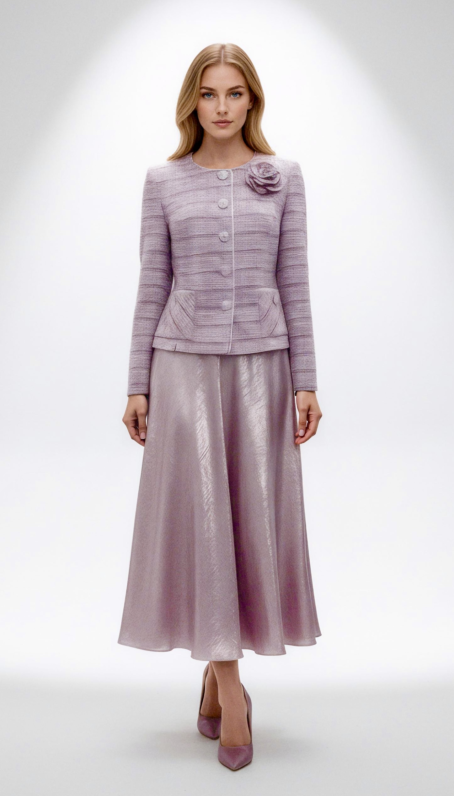 Zestaw składa się z dopasowanego żakietu wykonanego z miękkiego, elastycznego jerseyu oraz satynowej spódnicy o subtelnym połysku.