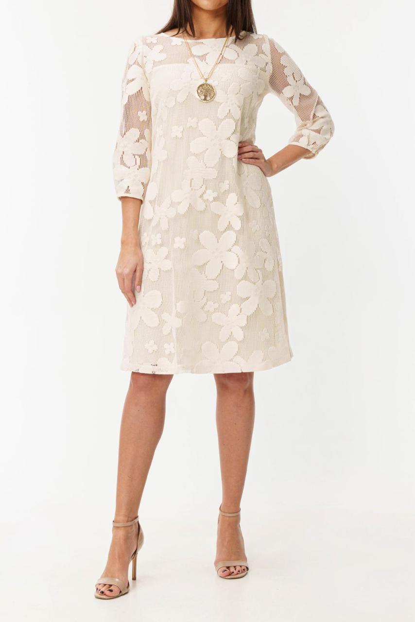 Sukienka z miękkiej koronki w kolorze ecru , to idealna propozycja dla miłośniczek subtelnego, romantycznego stylu. Charakteryzuje się luźnym krojem w literę A, który delikatnie układa się na sylwetce, zapewniając komfort w noszeniu. Sukienka ma długość za kolano, co dodaje jej elegancji i swobody .Rękawy 3/4,lekko szersze, zapinane na ozdobny guzik. Górna część sukienki oraz rękawy nie posiadają podszewki, co dodaje jej lekkości i kobiecości. Doskonała na wiosenne i letnie dni, idealna na różnorodne okazje: wesela , chrzciny czy jubileusze.